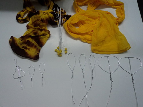 Chuẩn bị làm lan hồ điệp bằng vải voan như Vải voan, kéo, thép, băng dính, kìm nhỏ,3 khung 3 cm,2 khung 2 cm,1 khung 2,5 cm,1 khung 4 cm,2 khung 5 cm
